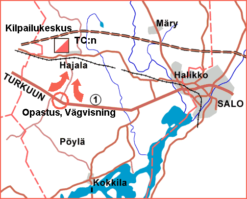 Opastus kilpailukeskukseen "Myltyryyn" on Valtatie 1:ltä 15 km Salosta Turun suuntaan Hajalan risteyksestä ja Vanhalta Turuntieltä Hajalan taajamasta. Opasteet ovat paikalla lauantaiaamuna klo 8.00. Samling till TC:n finns från Väg nummer 1 (Åbo - Helsingfors) 14 km före Salo, ca. 35 km från Åbo.