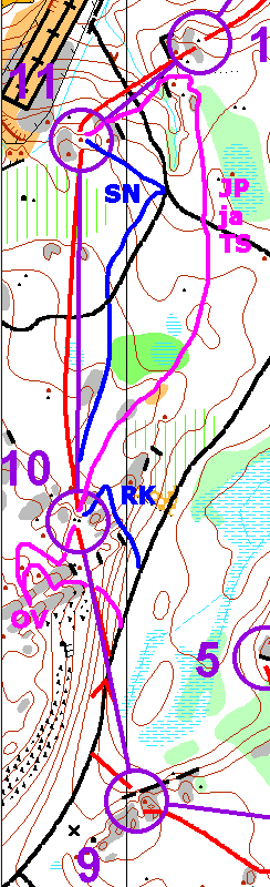 Rastivälit 9 - 11Kymppirastille nousussa pohja-ajan teki Valtsu Ollin pummatessa vaihteeksi rastia yli minuutin. Huolimattomasti mäkeen nousi myös Ryde. Ratamestari odotteli mielenkiinnolla etukäteen kolmen viimeisen alamäkivälin kiemuroita ja niitähän tuli. Koko kisan komeimman pummin rakenteli yhdellätoista parivaljakko Andelmaa - Sjöholm, jotka kävivät lähes tarkistamassa jo seuraavankin rastin. Mittakaava (1:7 500) ja avoimessa rinteessä kompassiin katsomatta jättäminen kostautui ja kahden minuutin pummi oli valmis. Myös Sammy käväisi tarkistamassa sijainnin polkujen ristyksestä juostuaan polun vieressä lähes puolet rastivälistä. Tässä vaiheessa lopullinen kärkiviisikko oli 3. ja 4. rastin jälkeen jälleen koossa, mutta järjestys vielä hieman ratkomatta.