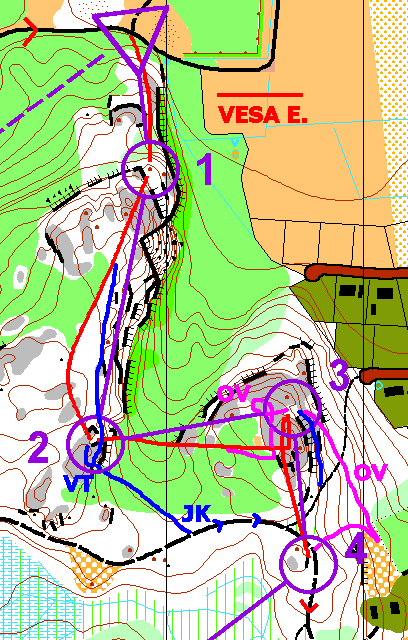 Rastivälit 1 - 4Lyhyellä ykkösvälillä ei kisaa vielä ratkaistu muiden kuin Nybergin Tommin osalta, joka kulutti väliin 1.52 Ryden tehdessä pohja-ajan 57 sekuntia. Olli pienestä rastivälin loppumutkasta huolimatta jakoi kakkossijan Sammyn kanssa, joka omien sanojensa mukaan olikin sitten loppumatkan aivan hapoilla, illasta puhumattakaan... Kakkosvälillä erot pysyivät edelleen pieninä. Valtteri teki rastiympyrässä ympyrän Veskun ja Mikan kellottaessa pohjat. Kokonaistilanteessa Vesku ja Mika myös kärjessä Ollin ja Ryden seuratessa neljän sekunnin sisällä seuraavina. Kolmosvälillä tarjottiin tiheikön kiertoa oikealta. Pisimmän kierron teki Janne tullen rastille vielä alakautta. Kierto oli noin puoli minuuttia nopeinta, eli Mikaa hitaampi. Ryden loivalla kierrolla eroa tuli lisää 20 sekuntia ja Ollin pummilla mäen päällä n. 40 sekuntia lisää. Kymmenen ensimmäistä vielä kuitenkin 1.01 sisällä.
