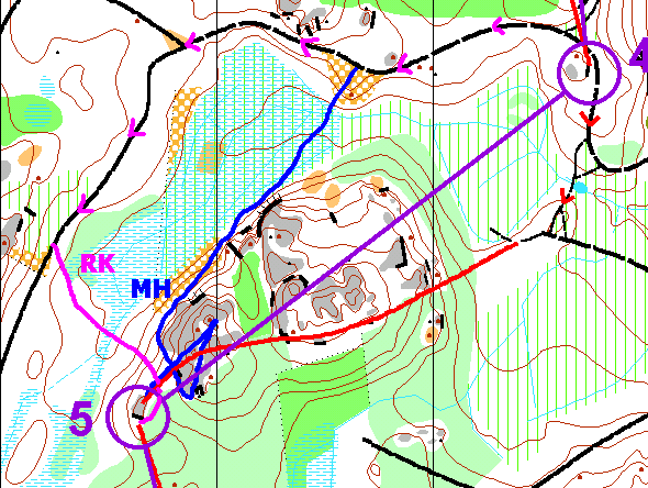 Rastiväli 4 - 5Viitosrastilla Mika onnistui sitten ratkaisemaan kisan Veskun eduksi tehden rastilla pitkälti yli minuutin pummin mäen päälle. Noviisi sai myös samalla seuraaville väleille hyvän veturin (ainakin hetkeksi). Rastilla ensimmäistä kertaa johdossa myös rastivälin nopeimmalla ajalla Sirkkulan väliaikainen oma poika Noviisi toisen Sirkkulan pojan, Veskun ollessa sekunnin jäljessä. JiiPee oli vielä tässä vaiheessa mukavasti kolmantena. Ryden polkukierto kokonaan oikealta oli ideana hyvä, mutta toteutus liian hidas, 20 sekuntia takkiin lönkyttelyllä ja heikohkolla rastinotolla.