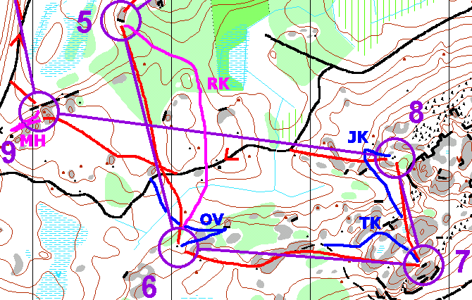 Rastivälit 5 - 9Kuudes ja seitsemäs rasti eivät kokonaistilannetta kärjen osalta juuri muuttaneet. Kuutosvälillä epäonnistuivat Mädi ja Ryde sujumattomalla menolla (Mädi vielä seiskavälilläkin) sekä kuutosrastilla jälleen Olli häröilemällä rastivälillä kauas vasemmalle rinteeseen. Seiskalla kärjen tilanne siis Noviisi 12.09, Vesku 12.26, JiiPee 12.40 ja kovaa kulkeva Crack 12.52.