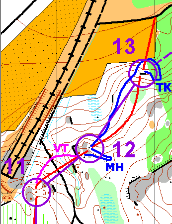 Rastivälit 11 - MRastiväli 12 osoittautui sitten voiton kannalta ratkaisevaksi. Vesa jatkoi virheettömästi Noviisin ja Crackin pummatessa. Noviisin reittipiirros puuttuu, joten 20 sekunnin virheelle ei löydy meriselitystä. Crack viihtyi välillä vielä kauemmin ollen välin hitain. Alle minuutin rastivälillä kuluttivat vain Vesku, Janne ja Valtsu, jonka reitille ei tullut ojanotkoon laskeutumista lainkaan, vaan kohtalaisen hyvää rinnettä alas ojalle ja sama nousu ylös kuin muillakin. Nerokasta. Viimeisellä rastilla ratkottiin vielä Mädin ja Ryden järjestys Mädin pummatessa rastia yli minuutin. Myös Valtsu ja Sammy tekivät kiemurat rastiympyrässä ja päästivät Tommi N:n tuntumaan ja Sammy jopa ensimmäisen kerran kisassa edelleen.