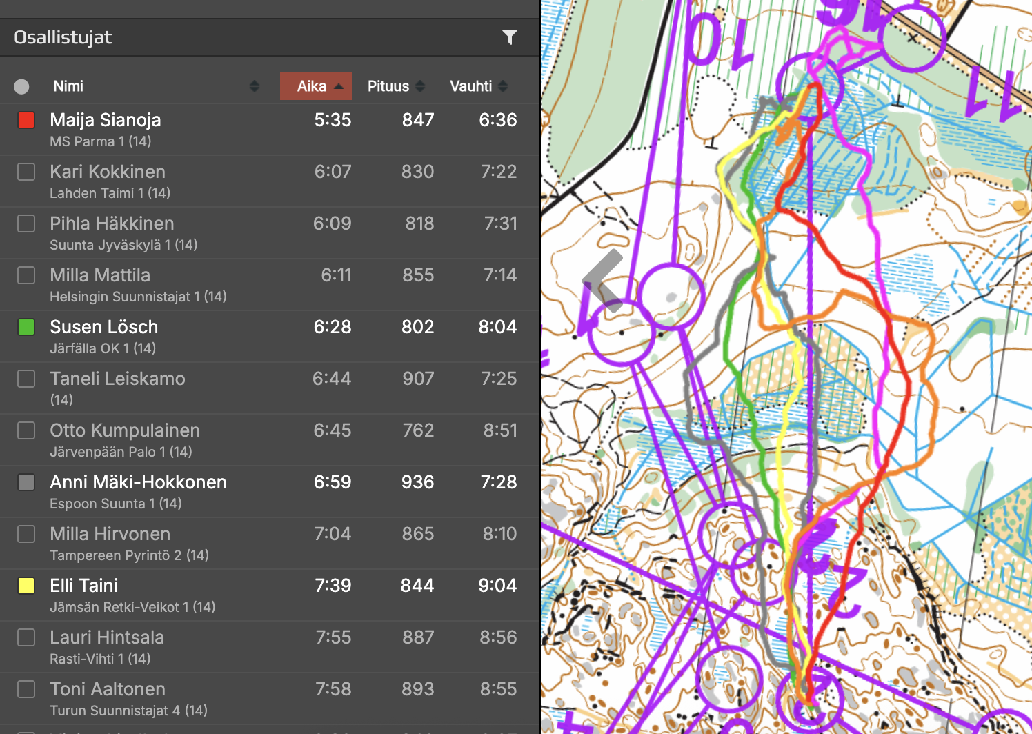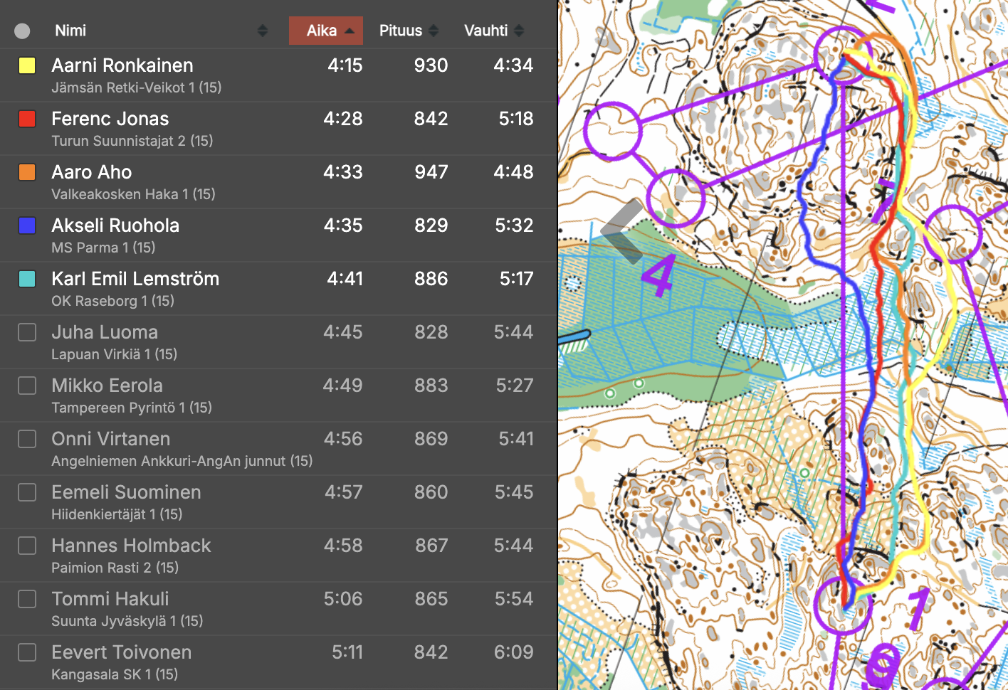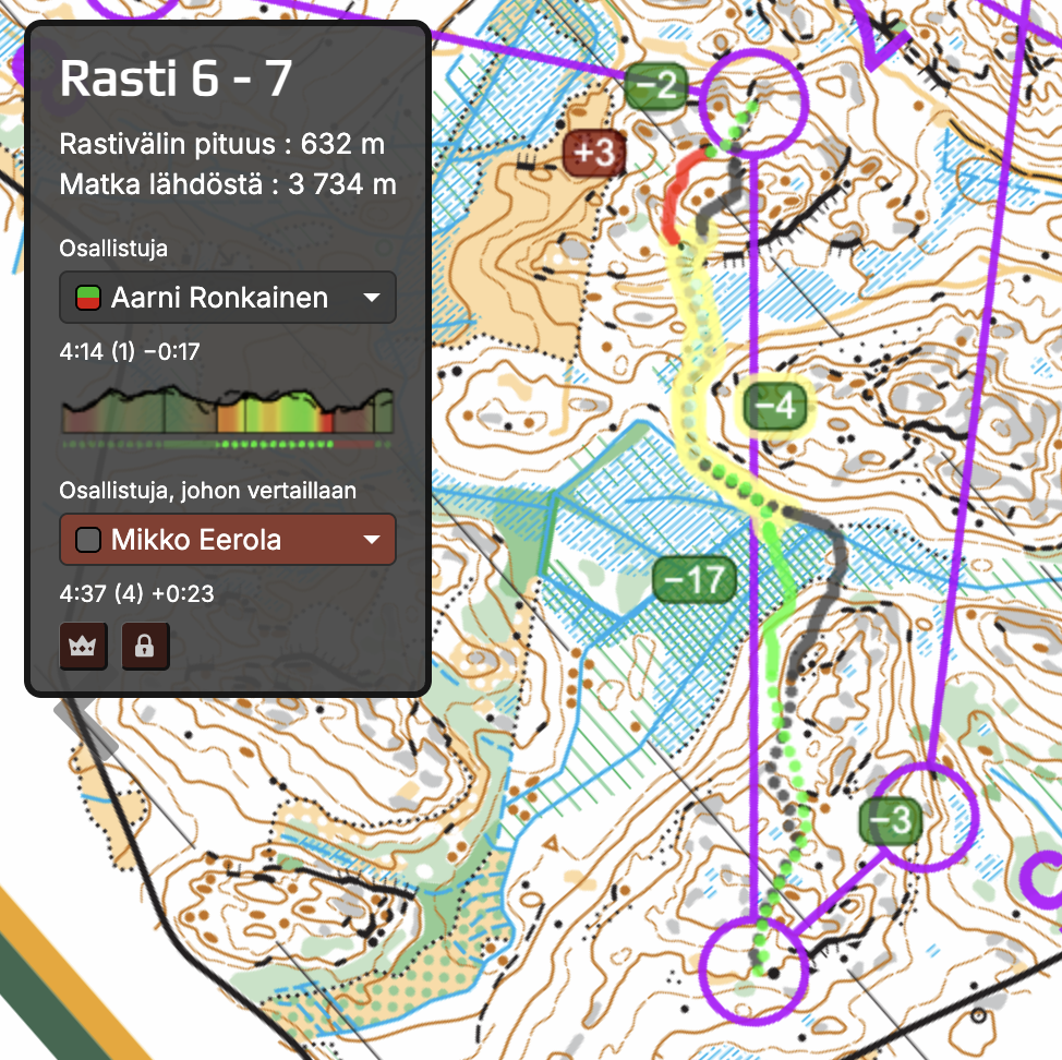15. osuus 6-7Ajattelin, että tuplapystyvihreä kannattaisi kiertää, mutta niin vain nopeimmat ryskivät siitä läpi. Joskus se menee näin. Lopussa Ronkaisen mäen kierto on parempi - vertailu vain näyttää tässä hieman väärin.