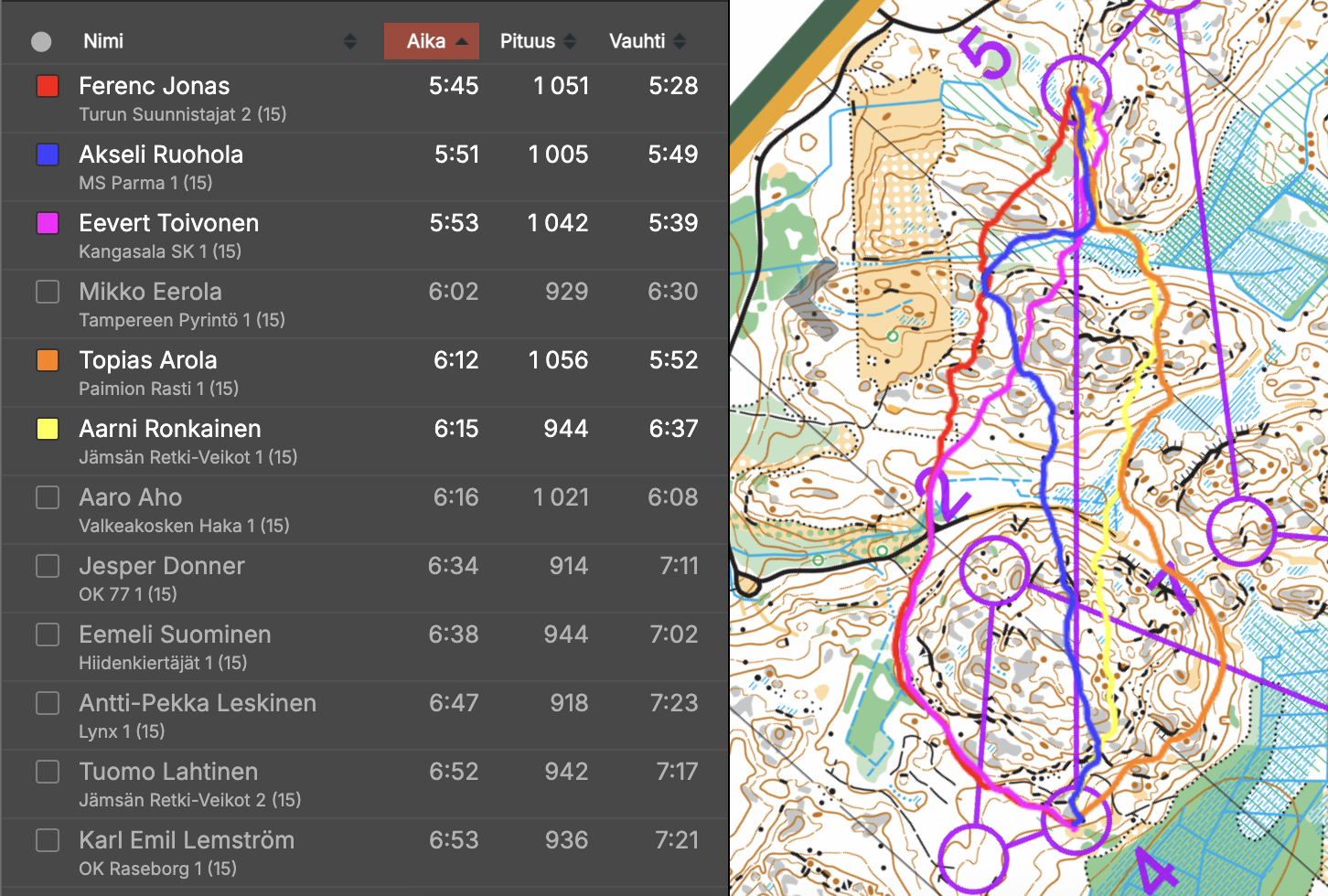 15. osuus: 4-5Tähän rastiväliin tein jopa koejuoksukellotuksen ja lopputulos on minusta varsin hyvä. Lähtörasti oli ensin jyrkänteessä, mutta siitä lähtö oikealle ei olisi ollut relevantti. Kivi taas tuntui olevan liian oikealla, niinpä rastipisteeksi valikoitui avokallionenän juuri. Väli oli vasemmalta uraa pitkin nopeampi kuin suoraan mäen yli. Kun kärkijoukkueista yksi toisensa jälkeen lähti toteuttamaan väliä suoraan, mietin menikö tämä kuitenkin vihkoon. Lopulta kuitenkin TuS kakkosen Jonas Ferenc kiersi mäen ja juoksi rastivälipohjat. Kangasala SK:n Eevert Toivosen valinta oli aika lähellä optimia.