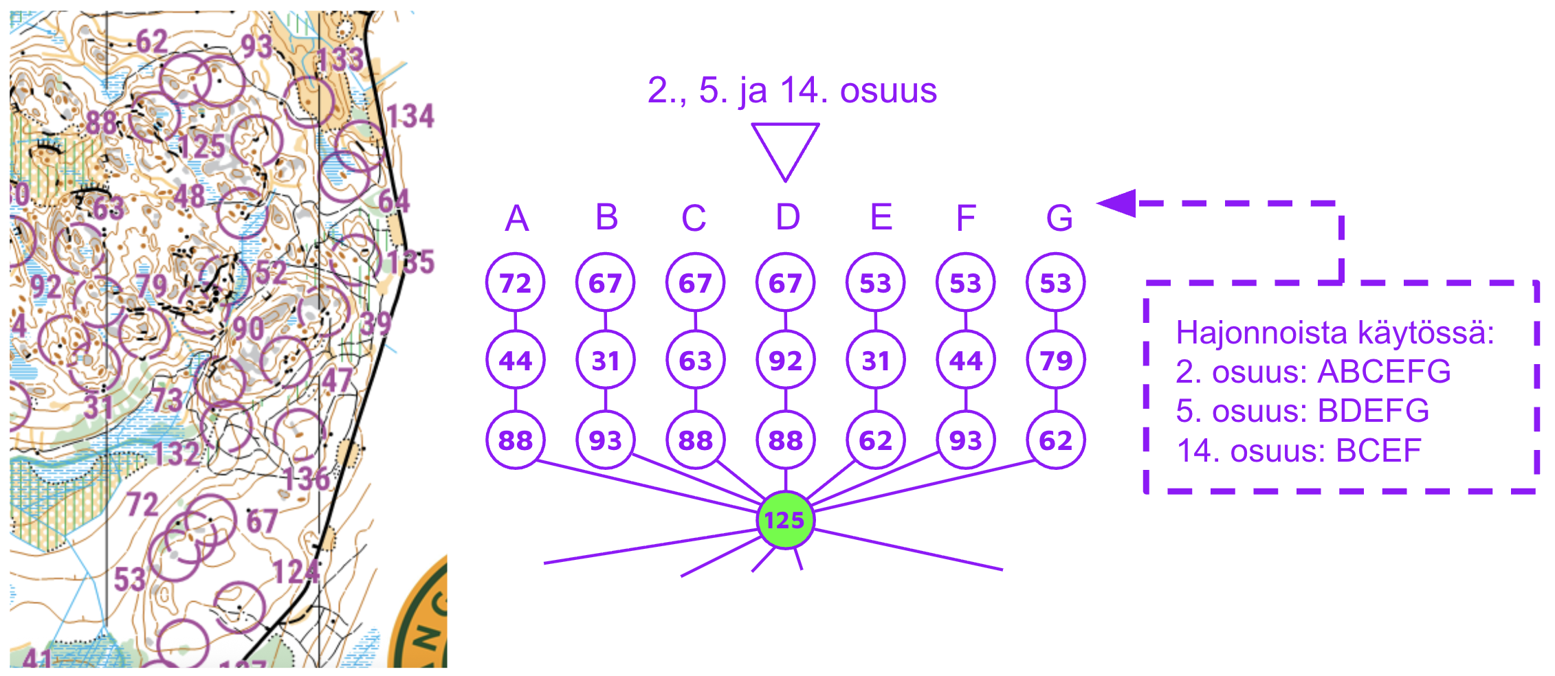 Lasten Halikko-juoksuYlipitkän 12-sarjan taitotasoa vastaavan radan suunnitteleminen syrjäkylien maastoihin ei aina ole aivan ongelmatonta. Lähtökohtana suunnittelussa oli, että reitinvalinnoissa pystyttäisiin tukeutumaan metsäautotiehen, joka oli maaston harvoja aidosti todella selkeitä kohteita. Pyrin suunnittelemaan rastivälejä siten, että tievalinnat olisivat täysin relevantteja, joissain tapauksessa ehkä parhaillekin nopeampia. Oli suuri yllätys, että välejä juostiin niin paljon suoraan. Henkilökohtaisessa kilpailussa reitinvalintojen jakauma olisi näyttänyt varmasti toisenlaisena. Lasten juoksun GPS-seuranta Halikko-viestin osuuksien 2, 5 ja 14 alun hajontaOsuuksien alkuun tuli 7 eri variaatiota sisältänyt hajonta. Se ei ollut itseisarvo, mutta se muotoutui näin, kun 14 osuuden hajontaa ei saanut hyvin yhdistettyä pelkästään toisen tai viidennen osuuden kanssa. Ongelmina olivat joka osuudella poikittain kulkeneet rastivälit, jotka blokkasivat osan kakkosrasteista piirtoteknisistä syistä. Toiseksi, ykkösrasteista 72 oli käytettävissä vain toisella osuudella, koska osuudet 4 ja 15 käyttivät samaa rastia eri suunnasta juostuna. Lisäksi halusin valikoida osuudelle 14 mahdollisimman tasapuoliset hajontavariaatiot käyttöön.