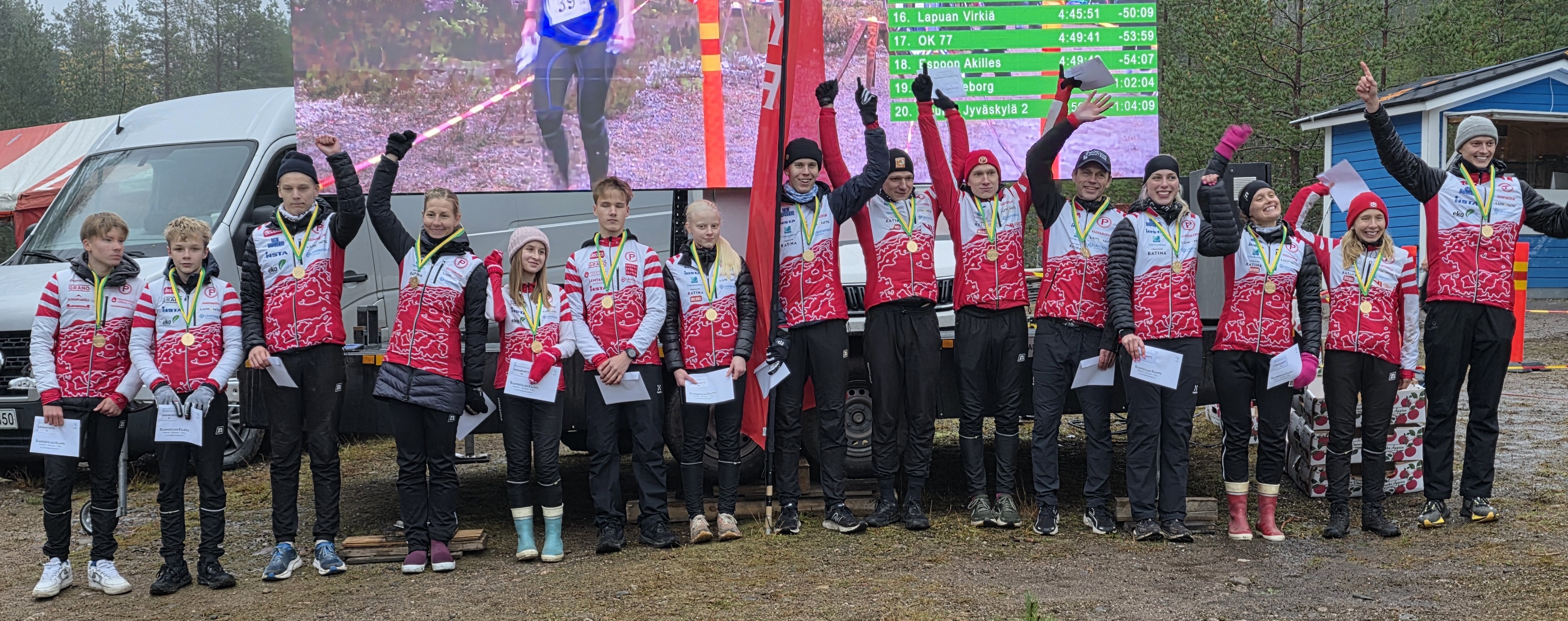 Voittajajoukkueessa juoksivat Vilho Hietala, Anniina Taipale, Teemu Karjalainen, Lauri Pohjola, Helinä Wannas, Katri Niittymäki, Nuutti Hietala, Lauri Oikarinen, Tuomo Lahtinen, Tommi Sivill, Selma Mäkäräinen, Kasper Ekonoja, Pihla Häkkinen, Tuukka Senttula, Veera Klemettinen. Kuva Raino Lampinen